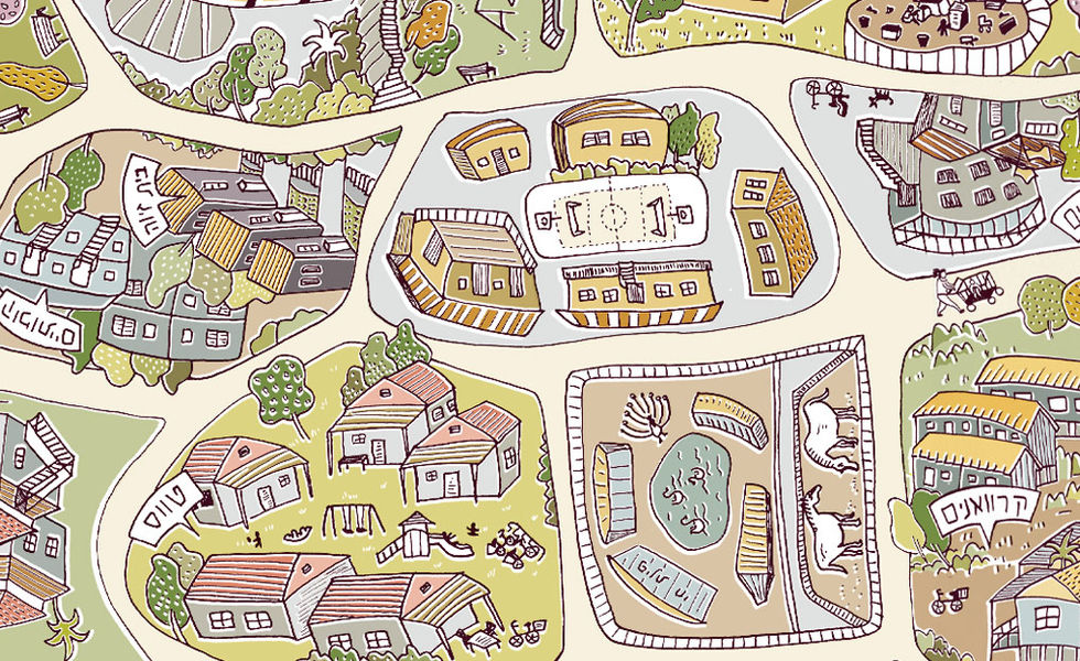 מפה מאויירת שמתארת לפרטי פרטים את קיבוץ מעגן מיכאל, הקיבוץ שלי. זה קיבוץ עשיר בהרבה פרטים שמרכיבים את השלם: גן הפסלים, הקקטוסים של אריק, מגרש ביה״ס הישן, פינת החי, קלנועיות ואופניים, מלא נשים בהריון ועגלולים מלאי תינוקות, כלבים וחתולים (ואנשים שמאכילים אותם) ואפילו חניית כלבים ליד החדר אוכל. לכל שכונה האופי והייחוד שלה, לכל פינה יש סיפור והיסטוריה, והכל מוקף בהמון עצי דקל וצמחייה עשירה. ניתנה לי הזכות ליצור את המפה הזו שמבטאת את הנשמה והקסם של מעגן מיכאל. המפה חולקה לחברים בחג המשק.